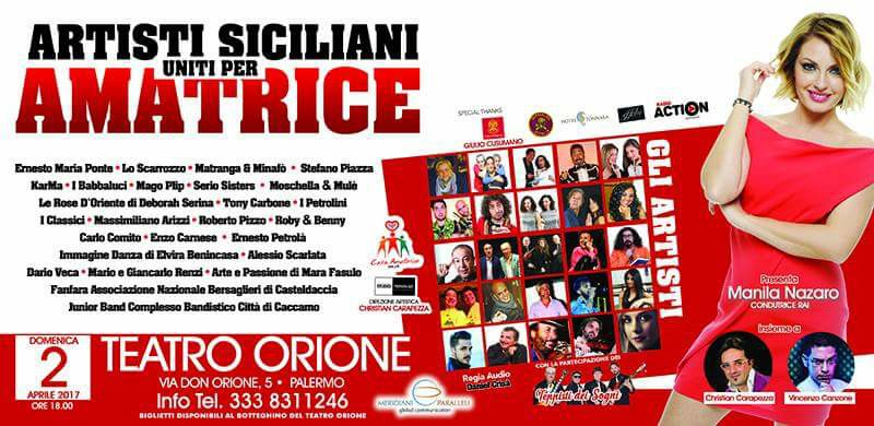 Tutto esaurito al Teatro Orione di Palermo per il grande evento in beneficenza per le vittime del terremoto del centro Italia, la manifestazione “Artisti Siciliani uniti per Amatrice” ha visto in scena i talenti siciliani del calibro di: Ernesto Maria Ponte, lo Scarrozzo, Matranga & Minafò, Stefano Piazza, KarMa, i Babbaluci, Mago Plip, Serio Sisters, Moschella & Mulè, le Rose d’Oriente di Deborah Serina, Tony Carbone, i Petrolini, i Classici, Massimiliano Arizzi, Roberto Pizzo, Roby e Benny, Carlo Comito, Enzo Carnese, Ernesto Petrolà, Immagine danza di Elvira Benincasa, Alessio Scarlata, Dario Veca, Mario e Giancarlo Renzi, Arte e passione di Mara Fasulo, Fanfara Associazione Nazionale bersaglieri di Casteldaccia, Junior club Complesso bandistico città di Caccamo, hanno partecipato anche i Teppisti dei sogni. Regia Audio a cura di Daniele Crisà.