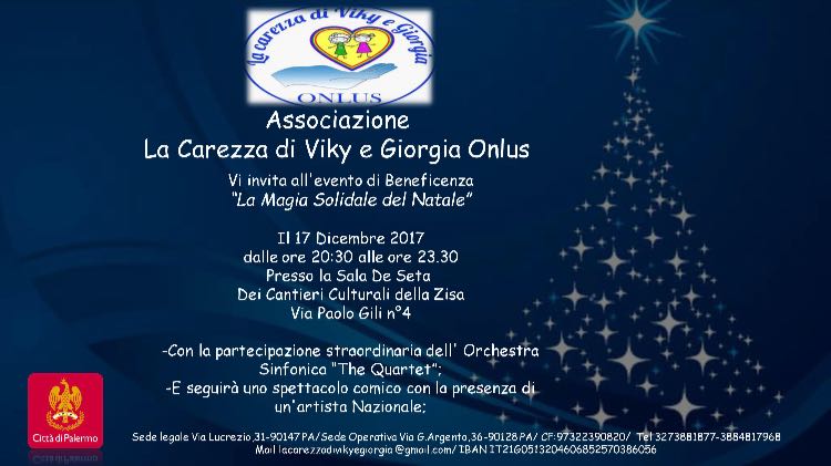 Si terrà domenica 17 dicembre alle ore 20:30 presso la Sala De Seta dei Cantieri Culturali della Zisa, “La Magia Solidale del Natale”. L’evento benefico, organizzato dall’associazione “La Carezza di Viky e Giorgia Onlus“, con il patrocinio del Comune di Palermo, si aprirà con un coro di voci bianche che intoneranno un canto natalizio. Seguirà la proiezione di un video che riassumerà le attività svolte dall’associazione durante l’anno. Hanno dato il loro contributo alla realizzazione della serata anche i “The Quartet” che si esibiranno gratuitamente sul palco del De Seta a sostegno dell’associazione. Momenti di comicità anche con un ospite nazionale che, a sorpresa, si esibirà per il pubblico durante la serata. All’evento saranno presenti inoltre rappresentanti dell’ordine dei medici, ordine degli avvocati, Polizia di Stato, scuole e associazioni del territorio. “La carezza di Viky e Giorgia” si occupa di supportare le famiglie di minori e in particolare dei minori cardiopatici (e adulti cardiopatici congeniti) al fine di risolvere le problematiche attinenti l’aspetto socio-sanitario, socio-assistenziale, socio-psicologico e socio-giuridico e svolge attività ludico-ricreative all’interno dell’Ospedale dei Bambini di Palermo.
