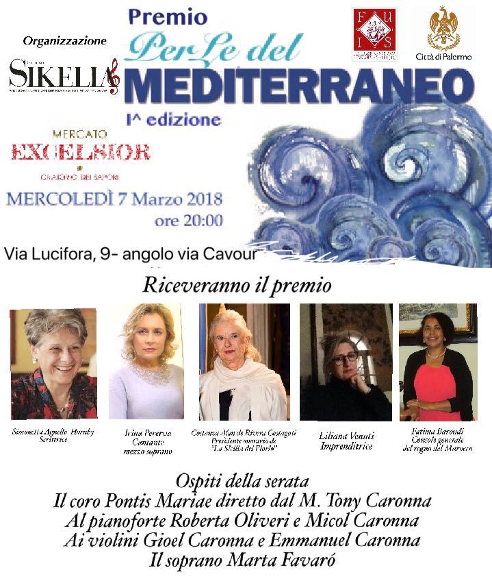 Un premio dedicato all’universo femminile, alle donne speciali che con il loro operato si sono distinte nel campo artistico, professionale, sociale, politico e nella vita. Grandi donne che hanno dato importanti contributi alla società in cui viviamo. Donne attente in famiglia e professioniste nel lavoro. Ed è a loro che l’associazione Sikelia, presieduta da Sara Favarò, con il patrocinio del Comune di Palermo, assegnerà il premio “Le PerLe del Mediterraneo”. La serata, con musica e premiazioni, si terrà mercoledì 7 marzo alle ore 20 presso il Mercato Excelsior in via Lucifora 9 angolo via Cavour (sopra Feltrinelli). Nella prima edizione il premio sarà consegnato alla scrittrice Simonetta Agnello Hornby; alla presidente della Commissione Cultura dell’Automobile Club Palermo, Costanza Afan de Rivera Costaguti; al mezzo soprano Irina Pererva; all’imprenditrice Liliana Venuti diplomata alla scuola dell’arte di Lugano e specializzata in design del tessuto; al console generale del regno di Marocco, Fatima Baroudi. Tutte donne vissute all’estero ma che all’Italia hanno donato la loro professionalità e la loro arte. Ospiti della serata il Coro Pontis Mariae diretto dal Maestro Tony Caronna. Al pianoforte Roberta Oliveri e Micol Caronna; ai violini Gioel Caronna e Emmanuel Caronna; il soprano Marta Favarò. Durante la serata il pubblico potrà assistere in anteprima anche ad un estratto dello spettacolo “Viva Palermo e Santa Rosalia” di e con Sara Favarò, con il sopranista Alessio Scarlata e il soprano Marta Favarò, che si terrà il 7 aprile presso il teatro Lelio.