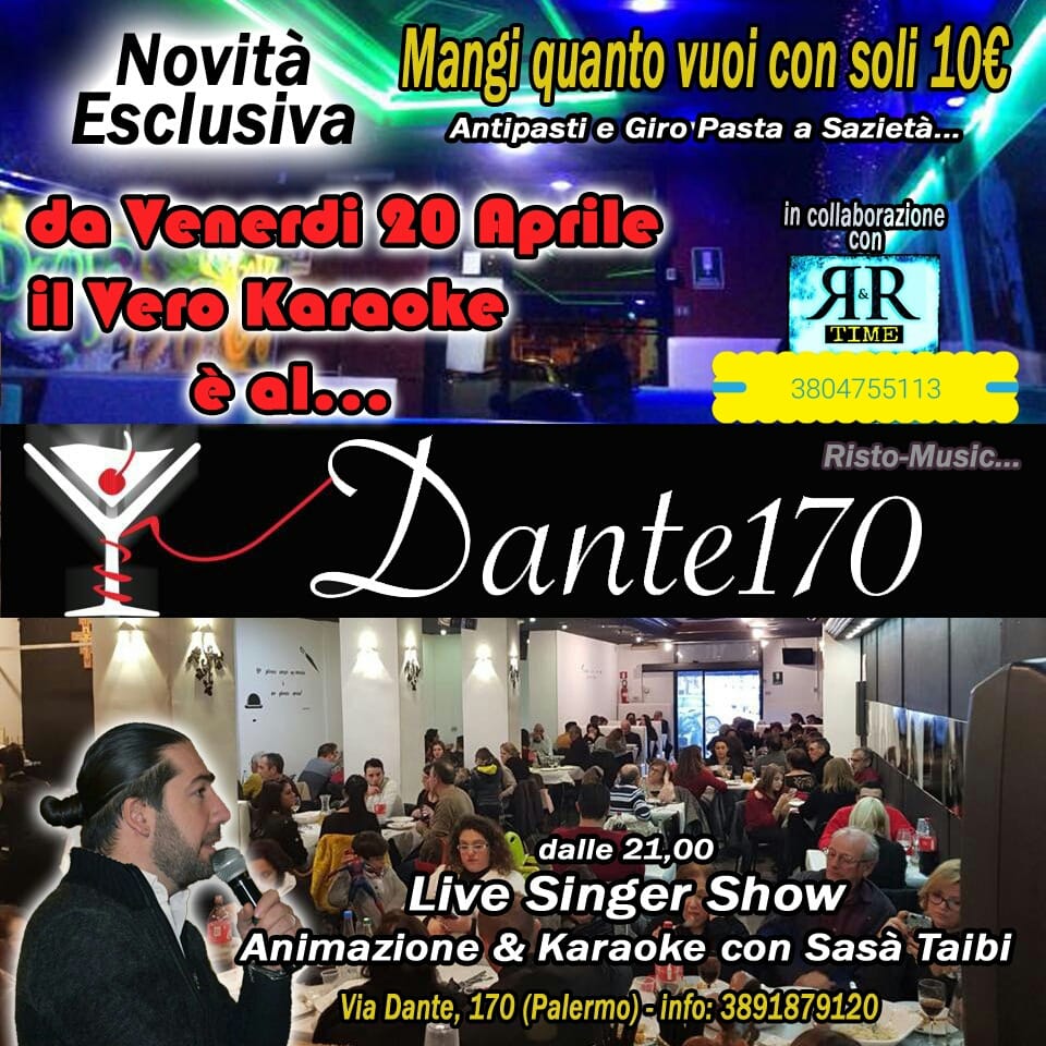 Musica dal vivo, animazione e karaoke con lo showman Sasà Taibi, venerdì 20 aprile a partire dalle ore 21 al Dante 170. Una serata divertente, accompagnata dalla buona musica e dal buon cibo. Con soli 10 euro si potrà accedere al ricco buffet di antipasti, e a seguire si potranno ordinare i primi al tavolo, senza limiti e porzioni, in una location accogliente ed elegante. Mangi quanto vuoi fino a sazietà con il prezzo fisso di 10 euro e dinanzi ad un buon piatto e ad un calice di vino, l’atmosfera sarà animata da musica dal vivo. Sasà Taibi con il suo ampio repertorio, fatto di classici e hit del momento, vi intratterrà con la sua musica e con il karaoke vi permetterà di mostrare le vostre doti canore. Ottima cucina e servizio impeccabile fanno del Dante 170 la location perfetta dove gustare buon cibo e divertirsi con gli amici.