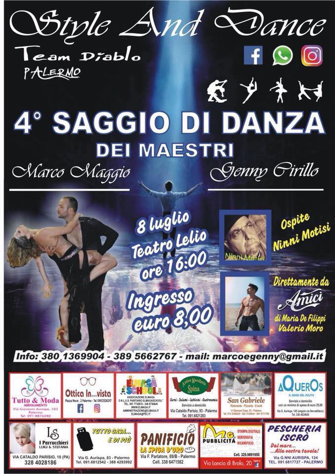 Domenica 8 luglio a partire dalle ore 16:00 presso il teatro Lelio (in via Antonio Furitano 5/A) si terrà il 4° saggio della scuola di danza “Style and Dance” di Marco Maggio e Genny Cirillo. Sul palcoscenico teatrale gli allievi della scuola si esibiranno in diverse coreografie e daranno prova del loro talento, della preparazione tecnica e dei risultati raggiunti. Durante la serata, che sarà presentata dalla giornalista Anna Cane, gli allievi daranno prova dei risultati raggiunti durante l’anno. Ospiti della serata l’attore Ninni Motisi e direttamente da Amici di Maria De Filippi, il ballerino Valerio Moro.