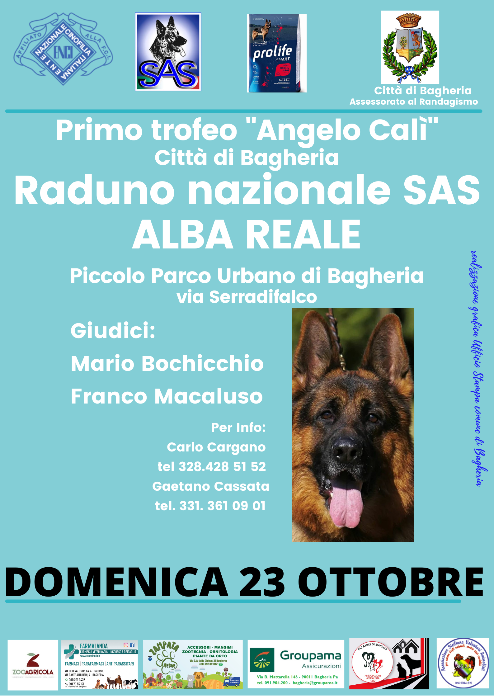 Bagheria, 05.10.2022 – Un evento dedicato agli amici a quattrozampe: Pastori tedeschi da tutta Italia si incontrano a Bagheria. Si svolgerà domenica 23 ottobre 2022 presso il Piccolo Parco Urbano di Bagheria il raduno nazionale di cani razza pastore tedesco, organizzato dalla SAS (Società Amatori Schäferhunde),  la società specializzata che mira ad incrementare e valorizzare la razza del cane pastore tedesco e a potenziarne la selezione e l’allevamento, in collaborazione con l’ENCI (ente nazionale cinofilia italiana) e Prolife.