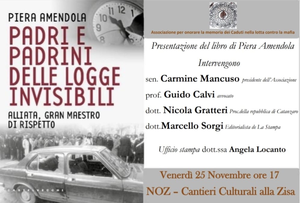 Il 25 novembre alle ore 17 ai Cantieri culturali alla Zisa di Palermo verrà presentato il libro di Piera Amendola “Padri e padrini delle logge invisibili. Alliata, gran maestro di rispetto”