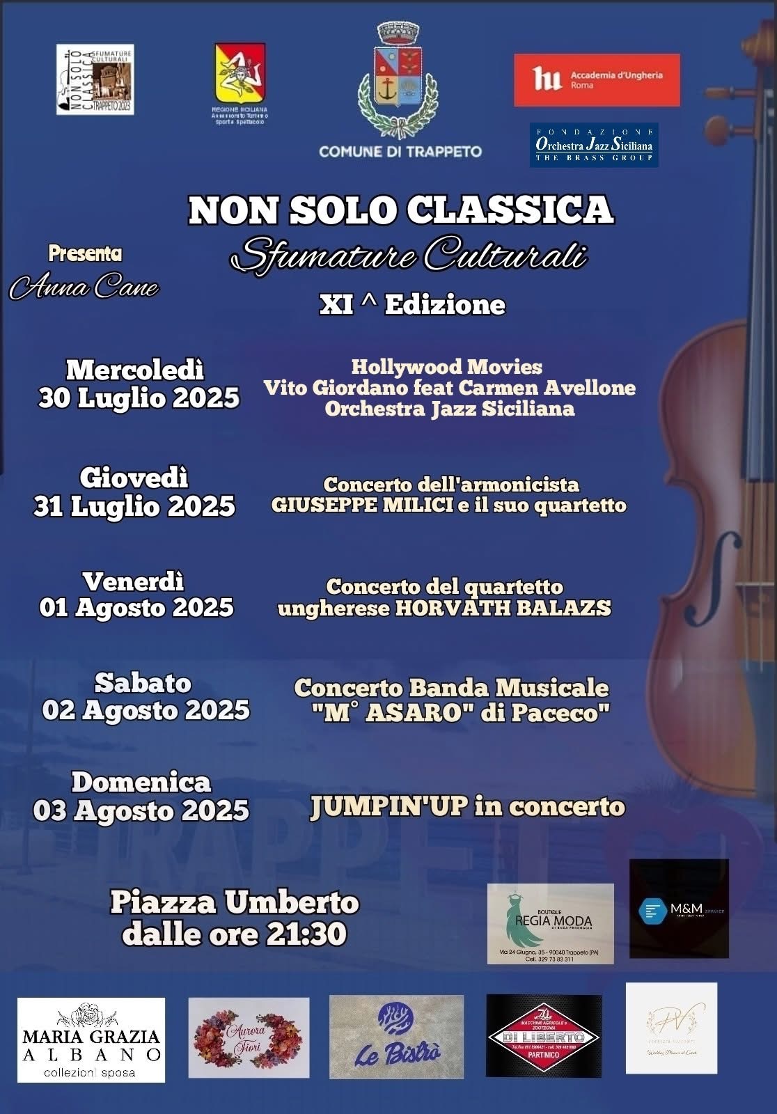 La grande musica torna a Trappeto con l’XI edizione di “Non solo classica, sfumature culturali”. Dal 30 luglio al 3 agosto, tutte le sere a partire dalle 21:30, musicisti di fama internazionale trasformeranno piazza Umberto I in un teatro sotto le stelle.
