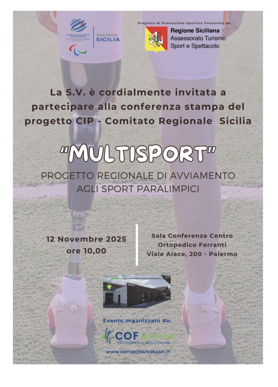 Mercoledì 12 novembre alle ore 10 presso il Centro ortopedico Ferranti in viale Aiace, 200 a Palermo, si terrà la conferenza stampa del progetto regionale di avviamento agli sport paralimpici Multisport del Cip, finanziato dall’assessorato regionale del Turismo, dello Sport e dello Spettacolo.